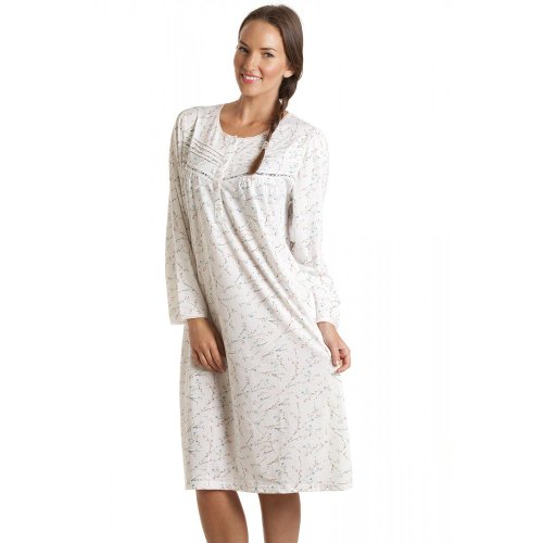 Cette chemise de nuit luxueuse présente un motif floral élégant. Elle est dotée de boutons et d'un petit noeud papillon. Ses longues manches sont idéales pour les froides nuits d'hiver. Très confortable. Couleurs disponibles : ivoire/rose, ivoire/bleu et turquoise. La chemise de nuit est dotée de dentelle au niveau du col à boutons.