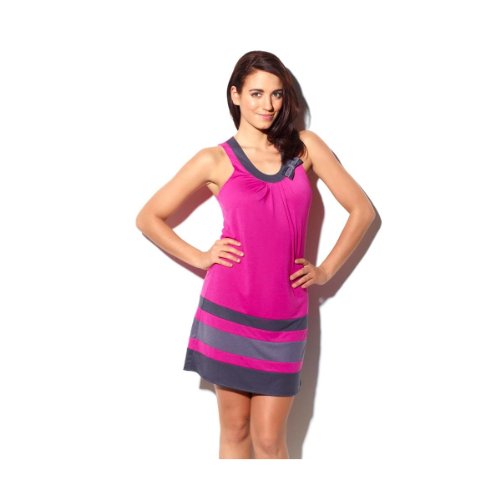 Nuisette fuchsia tout en viscose sans manche, effet plissé sur le devant au départ de l'encolure, le col est de couleur contrastante à l'image des bandes de couleurs et largeurs différentes pour son bas, gros nœud en viscose sur l'encolure sur lequel se noue un galon de dentelle.