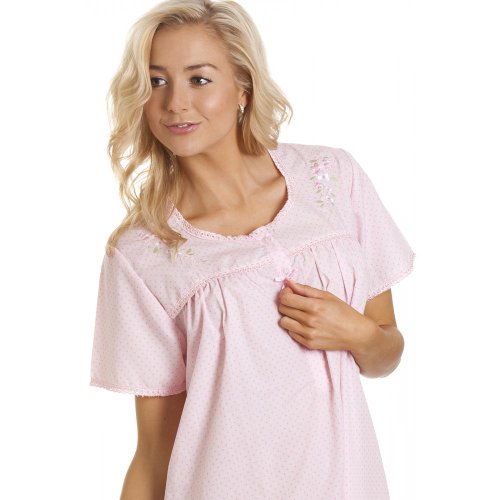 Cette superbe chemise de nuit sans manches vous tiendra chaud durant toute la nuit. Elle est rehaussée d'un motif floral rose au niveau des épaules et se ferme et s'ouvre facilement à l'aide d'une rangée de quatre boutons. Elle présente un motif à pois sur toute la surface.