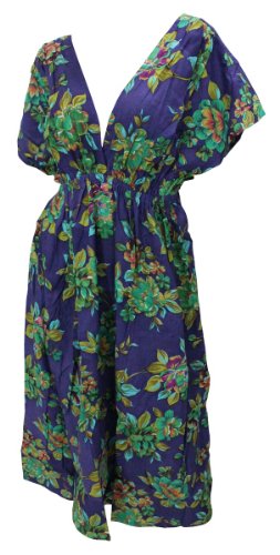 100% coton imprimé floral longtemps le tube Caftan Caftan bleu. ligne de cou sobre