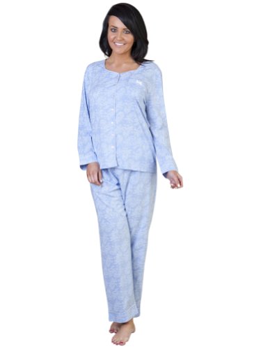 Lingerie de Nuit pour Femme/Vêtement de Nuit à Majorité en Coton Pour Mesdames Jersey Richement Imprimé Ensemble Pyjama à Boutons Sur le Devant, Bleu Grande/Très Grande Taille